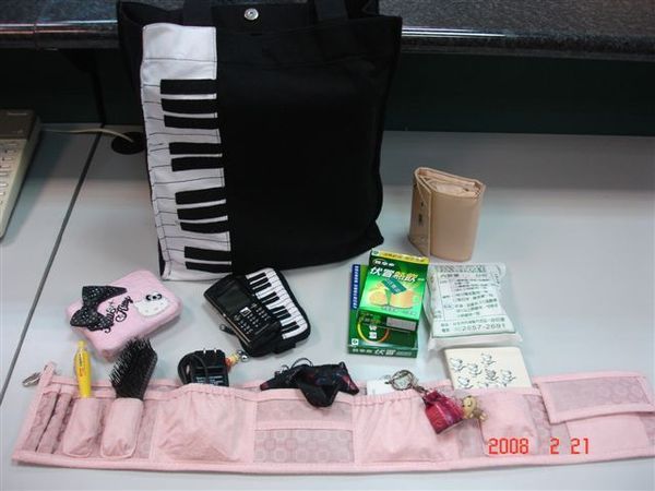 中午跟同事介紹我今年收到的第一份生日禮物,結果我主管看到也從她包包拿出一個一模一樣的,果然好像很不錯ㄋ。我拿出我的野田妹鋼琴包,同事智慧馬上過來看看我包包都裝啥,因為我的位子實在太像多拉的百寶袋,本來過完年把東西都清回家,開工不到兩個星期,位子裡又可以變出衣服、洗髮精、蠟燭、安全帽(這個是鼠哥的,借了一整個寒假,我開學就還你喔)。結果我的包塞滿了沒有整理的發票,智慧當會計的職業病馬上要抓狂了,開始幫我整理發票,還說如果我是她妹妹她一定會生氣= =好可怕喔,最後幫我把包包裡不要的廢紙、空的紅包袋、禮券袋都丟掉。既然包包都整理好了,就順便來一下包包內容物介紹文。