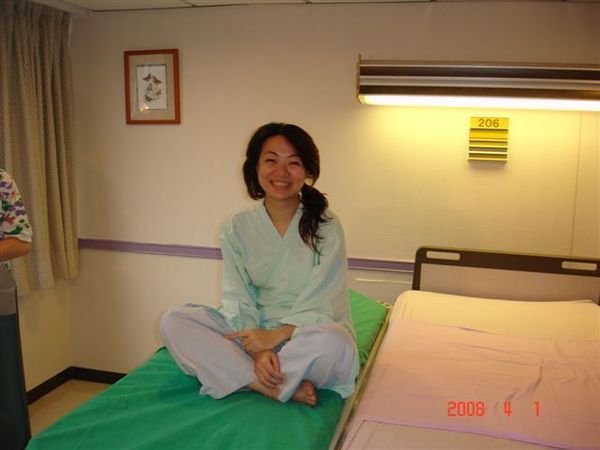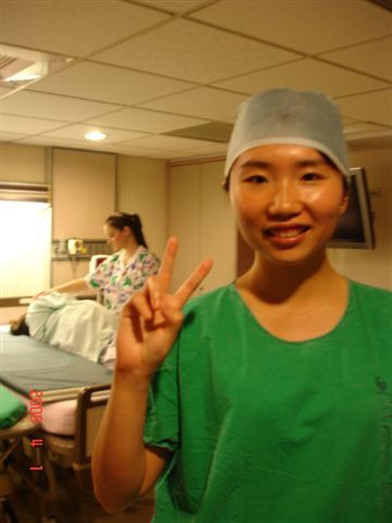 換回衣服之前大家特地拍照紀念,我這輩子應該沒有機會在穿開刀房的衣服,所以一直吵著要照相,不過全套開刀房的服裝其實不太好看,因為要力求專業的感覺,頭髮通通都要藏在帽子裡面,我最怕臉上沒有頭髮的樣子,本來是有戴口罩的,拍到一半拿掉了,我覺得我戴上口罩看起來應該很眼神銳利,一臉要幹掉病患的樣子吧。總之這是很難得的經驗,很不錯玩。