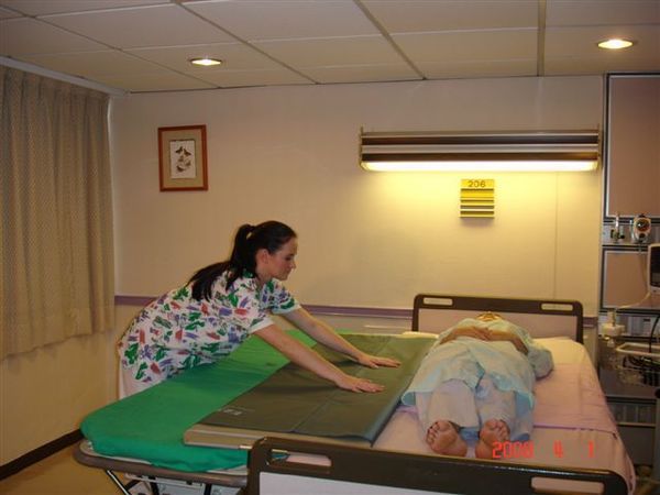還需要一個病人,就由新同事上場,因為她身材夠剛好,我太高了會顯得產品好像很難用= =她穿上病人服,厚~還真像病人呢,看起來一整個沒精神。