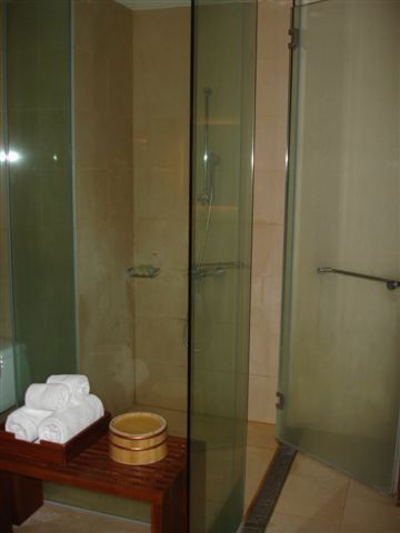 果然是景緻湯屋,真的很大間,有一整面很大的玻璃窗,可以看到對面山上的風景,不過我也有看到在爬山的人,我相信如果他們有帶望遠鏡搞不好也看得見我。水池也相當大,我可以在裡面撐著池邊打水。最棒的是有電視呢!剛好有播燕尾服,我不是很喜歡成龍杯杯,所以這部片一直沒看過,剛好趁現在看一下,才剛開始播,我們的泡湯時間有90分鐘,剛好可以看完一整部片。淋浴間跟洗手台等擺設,感覺就像飯店的浴室,只是浴缸超大。