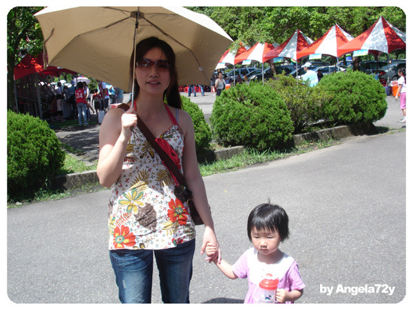 今天可是一個超大超大的大晴天,要走這樣一段路真是要我的命阿,我本來以為是可以騎腳踏車的,沒想到只有腳踏車隊是騎車去。擦上了係數48的防曬,戴上墨鏡跟洋傘,我跟太陽拼了!我們算很晚出發,帶著包仔又走走停停,所以前進得很慢,好不容易走完一半的時候已經快沒時間了,所以哈斯本就先往上走去過關,我跟包仔一組繼續用龜速前進。走到一半包仔突然就說她要抱抱,我也想要人抱抱,我也好累喔!跟她說我也好累,我們可以一起停下來休息一下再繼續走,或是不休息繼續走,不過沒有媽媽抱你的選項。所以我們停在路邊喝了一下水,拍下一張很累的自拍在繼續走。
