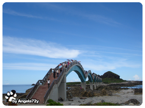 這八座拱橋真的讓人走得汗流浹背,不過爬到中間往下看,居然可以很清楚的看到水裡有魚在游呢,海邊的岩石也都造型特別。其實走著走著就走完了,到了拱橋對面的島又是不同的景色,感覺好適合玩生存遊戲喔。哈斯本還說他不敢相信他也有走過去那邊的一天,特別是跟著我們這些曬太陽無力的老弱婦孺,聽說之前婆婆都只有爬一個還是兩個拱橋就不走了,所以大家都沒走過去過,這次真是大家都拼命喔。不過這樣一耽擱,我們回程的時間又更晚了。