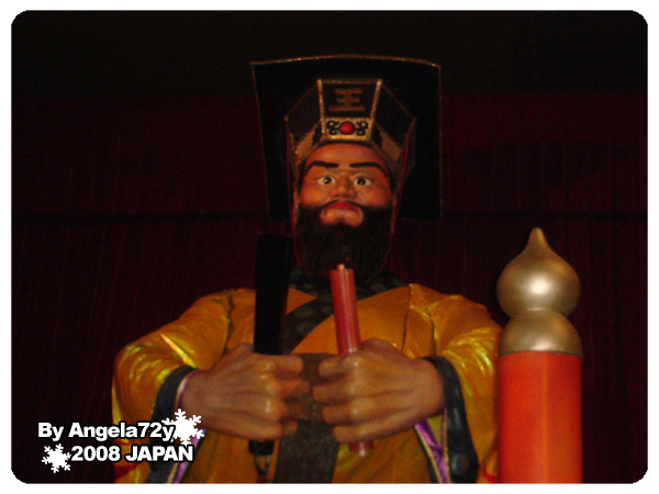 八點鐘,閻魔堂前面已經聚集了一些觀光客,我們也卡位開始錄影,很奇妙喔,閻王雕像的手舉起來之後就換上了一張凶惡的臉,搭配音樂跟光線,感覺好像真的很生氣呢,變臉的過程從音樂開始大約十分鐘,不過實際變臉的時間滿短的。我怕像機記憶卡不夠,所以每隔30秒就重按一次快門錄影,不過最噢的是,回房間整理照片的時候,我不知道哈斯本也整理了一次照片,我印象我應該拍到第三段才開始真正的變臉,大約播10秒看沒有變臉就把前兩段刪掉了,沒想到刪完兩段之後,就...沒有了!阿~阿~阿~救人阿,我拍得手好酸的閻王變臉呢,我好可憐喔。