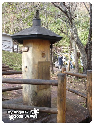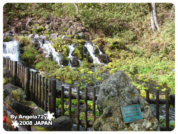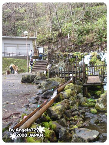 湧出的泉水,透過樹幹做的管道,從上往下引出,旁邊掛了很多杯子要讓人取水,我們也入境隨俗的拿了礦泉水的瓶子裝水,超級超級冰的,不過在喝下的時候,我心中其實在想,日本人都不怕水中有寄生蟲呢。真的有看到很多當地居民或商家吧,是拿很大的桶子要來裝水回去的,聽說以前飛航還沒有管制不能帶瓶裝水上機的時候,有觀光客真的會裝這邊的水回去說要給長輩泡茶。不知道能不能長生不老或養顏美容,不過喝起來這樣冰,提神醒腦就真的有了。