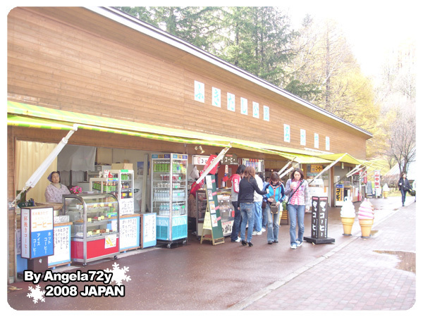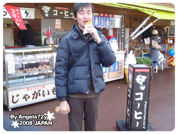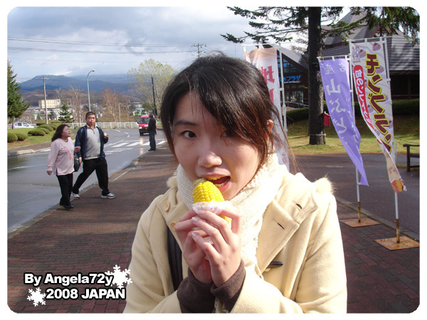 羊蹄湧水吹出公園的外面有一排商家,賣著一些小吃和紀念品,導遊有交代,請認明插國旗的第一家和第三家,這兩家的老闆很會做生意,日本人真的是服務業的代表性民族,導遊說會去北海道觀光的鄰近國家,以台灣人佔最大多數,他剛開始帶團的時候,第一家的老闆看到台灣團的客人來,就算客人沒有主動買東西,在下午的時段就會主動包一些吃的東西給客人帶走吃,因為吃的東西當天沒有賣出去,隔天也不能賣,且日本人相信,他有這樣好的服務態度,雖然你這次沒有惠顧他,下一次還是有機會可以做到你的生意。所以導遊也會跟客人推薦這家店舖,店舖當然也會給客人在價格上的優惠,我當然也相信也有給導遊^^"因為台灣的客人越來越多,後來老闆就在店舖插上了台灣的國旗表示友好,第三家的老闆看到第一家的生意總是特別好,後來總算發現奧妙之處,所以也跟著插上國旗跟給客人優惠。所以導遊會說『請認明插台灣國旗的喔』,不過第一家的水煮玉米真的超好吃的,可樂餅也好好吃喔,吃完還想再吃呢!