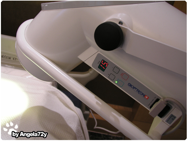 設定光療的照射時間為15分鐘,時間可以由機器上的 + - 符號來增減,設定好時間之後按下Start就會開始照射,機器上顯示的時間會自動倒數,時間到會自動停止,若是想要中途停止,只要按下Stop鍵就可以了。因為公司的展示間有床,所以我可以很舒服的躺15分鐘,剛好可以利用吃飯前的空檔去照。