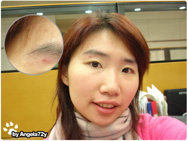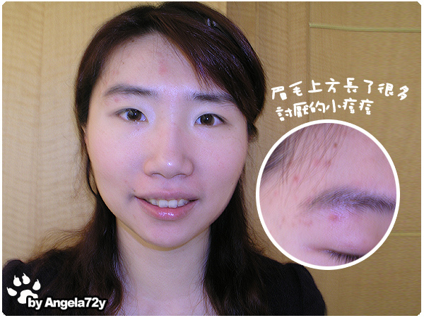先請同事幫我拍一張長痘痘的照片,最近因為長了痘痘,大家又瘋狂團購,一下蛋糕,一下魷魚絲,不只腰圍明顯增加,我覺得臉都寬了一點,加上很多人說我的新髮型很老氣,所以最近很少拍照。痘痘只集中在其中一邊的眉毛周圍跟額頭中間有一點,反而另外一邊比較多劉海蓋住的地方卻沒有長,這點實在讓人想不透。