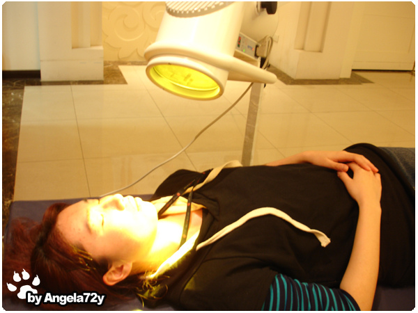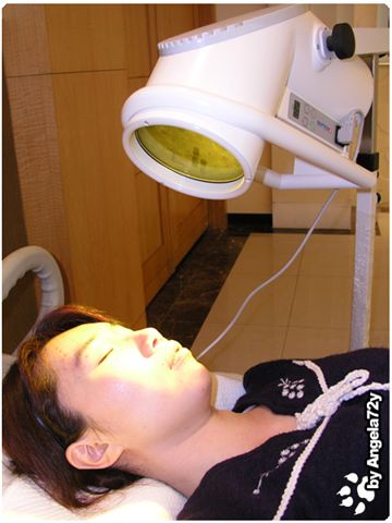光療的鏡頭與臉部要距離10~15公分,光源要垂直照射,只要閉上眼睛休息15分鐘就好了。光照射在臉上感覺溫溫的,大約5分鐘的時候剛剛噴上的活氧水就都吸收乾掉了,因此在照射的過程中,又補噴了兩次活氧水。閉著眼睛可以微微感覺到光亮,可是卻讓人覺得很放鬆有點想睡覺的感覺,15分鐘很快就過去了。