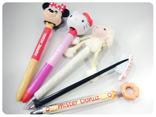 Bonny小姐想要看看我新換到的的donut筆,donut筆自己拍照太無聊了,所以把放在辦公室的造型筆都拉來一起合照...公司有米妮、Kitty、小羊、蝦握壽司、donut筆.......家裡還有其他很多可愛的造型筆喔